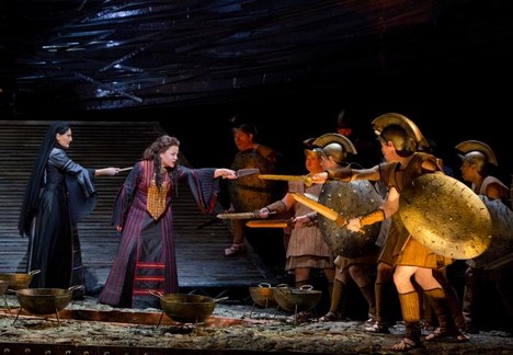Když už se Met rozhodla znovu vrátit Trójany na repertoár, bylo by patrně vhodnější zvolit jinou formu než obnovit nastudování z roku 2003 (ostatně žádné z dosavadních nastudování se dlouho neudrželo). Pokud režie Francescy Zambello a scéna Marie Bjernson už po premiéře vyvolávaly rozpaky a kritiku, třeba říci, že právem. Scéna je postmoderní směsicí citací antických motivů a znaků současnosti, kdy podivné prosklené půlkruhové „terárium“, obklopující trůn královny (který připomíná jakýsi „street view“ Kartága), působí již zcela neorganicky – zvláště ve spojení s kostýmy (Anita Yavich), které respektují Berliozovo časové umístění děje. Režie Zambello provokuje brutalitou při dobytí Troje, kdy zacházení s dětmi je na hranici únosnosti a vkusu – a bezradností, jak naložit s velkými baletními čísly (choreografie Doug Varone).