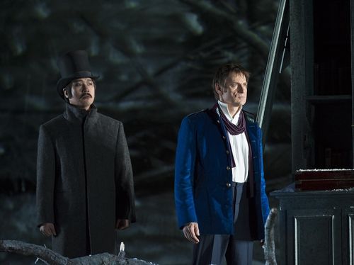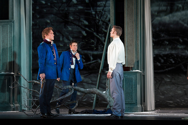 Také Oněgin Simona Keenlysida byl zjevně muž v letech. Zatímco Puškinův a Čajkovského Oněgin je muž velkého světa, vychovaný po „francouzsku“ a ctící společenskou etiketu, Oněgin v Covent Garden měl k dandymu daleko a připomínal svým oblečením spíše Jeníka z Prodanky než elegantního příslušníka petrohradské smetánky. Ovšem silnou emoci v sobě měla scéna, kdy před soubojem, v němž je zastupován svým mladým dvojníkem, z pohledu člověka, který už ví, jak to všechno dopadlo, úpěnlivě objímá Lenského ve snaze souboji zabránit. Když si po zastřelení Lenského sám přiloží pistoli ke spánku a váhá, zda nestisknout spoušť, je to jen prázdné gesto: soubojové pistole byly jen na jednu ránu a pak se musely znovu docela složitě nabíjet. S Lenským to nedopadlo dobře ani v rámci Holtenova režijního pojetí: nechal ho mrtvého ležet uprostřed jeviště až do konce a se postupně místo připomínky osudových okamžiků stal jen jakousi součástí interiéru. Ovšem pěvecky a v rámci dané koncepce i herecky byl slovenský tenorista Pavol Breslík excelentní a jeho výkon patřil v rámci přenosu k nejlepším.