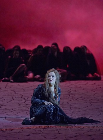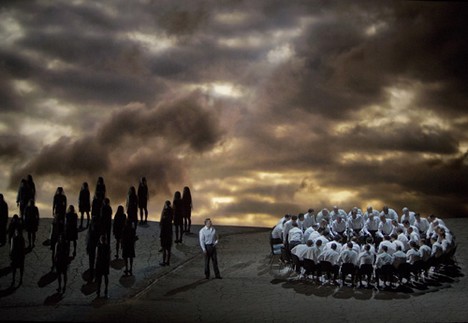 Scéna byla převážně temná, pochmurná, ve třetím dějství s mátožnými špinavými postavami v rozervaném oblečení. Když lopatami hloubí v rozpukané zemi jeden hrob vedle druhého, byla to apokalyptická vize světa „den poté“, než katarze směřující k zázraku nejvyšší spásy. Vše bylo podřízeno hlavně výtvarnému efektu a vnucovala docela praktická otázka, kdo všechny ty „zkrvavené“ kostýmy vypere a co to bude stát. (Výzvy o přestávkách k příspěvkům pro Met se v souvislosti s hadicemi agregátů, pumpujících na jeviště krvavou vodu, jevily poněkud nepatřičně.)