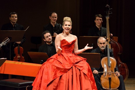 Na pódium Rudolfina vkráčela ve výrazné dráždivé červené korzetové róbě z dílny módní návrhářky Vivienne Westwood vytvořené pro tento projekt a zahájila koncert árií královny Orontey ze stejnojmenné opery Antonia Cestiho. A pokračovala strhující galerie královen, císařoven a princezen rozhodných i váhajících, despotických i skromných, milovaných i opouštěných, rozjásaných i trpících, sebevědomých i zhoubně žárlivých. Monteverdiho Ottavii z Korunovace Poppey, Giacomelliho princezně z Trabzonu (La Merope), Orlandiniho Berenici, Hasseho a také Händelově Kleopatře, Portově Ifigenii a Händelově Roxaně propůjčila pružnost a flexibilitu svého hlasu opřeného o skvělou dechovou techniku. Jakoby nic si „pohrává“ s perfektním frázováním, přechody dynamiky v messa di voce, technickou jistotou koloratur s velkými intervalovými skoky přes dvě oktávy, dlouhými neuvěřitelně rychlými stupnicovými běhy, mimořádně efektním rychlým staccatem a dalšími vkusně volenými ornamenty belcanta. Belcanto – krásný zpěv, přitom nechápe jako „výrobu“ ladně ušlechtilých tónů, ale jako nástroj, prostředek pro vyjádření emocí – vypjatých až k prasknutí i zklidněných a ponořených do hloubky prožitku. Velmi přesně ví, o čem zpívá, a dokáže dát svému hlasu patřičný výraz pro to které rozpoložení duše, od zoufalství, žalu a hněvu po zamilované snění a radostné nadšení.