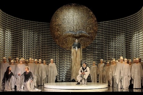Rocc pro ostravského Lohengrina zvolil abstraktní scénu ze závěsu, který tvořily bílé plastové koule navlečené na „šňůry“. Pokud bychom chtěli pátrat po spojitosti koulí s Lohengrinem, pak snad jako o labutí líhni, kde jsou pod modrým, červeným, fialovým nebo žlutým světlem vyrovnány tisíce vajec, z nichž se právě vyklubaly sošně vznešené figury ještě se zbytky skořápek na hlavách. A pochodovaly v secvičených pozicích. Roccovo (zjednodušené) výchozí chápání Elsy jako bílého dobra a Ortrudy jako černého zla vedlo k výkladu, v němž chtěl – Wagnerovi navzdory – tyto dvě ženy propojit v jednu bytost nazíranou z líce a rubu. V ostravském finále tak na rozdíl od Wagnera Elsin „odčarovaný“ bratr Gottfired nekončí v náručí své sestry, která klesá beze smyslů k zemi, ale v objetí triumfující Ortrudy v bílém.