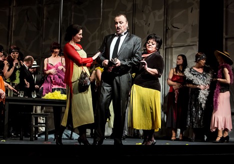 Úpravy se ovšem dotkly i hudby, a to velice razantně. Partitura byla osekána na jakýsi dvouhodinový „readers’s digest“. Pokud je taková úprava možná a přijatelná pro specifické podmínky krumlovského Otáčivého hlediště, kam má být inscenace pro letní stagionu přenesena, pak v tradičním divadelním prostoru ztrácela opodstatnění, včetně zopakování úvodní části předehry před závěrečným čtvrtým dějstvím v Seville nejspíše jen proto, aby se stihla přestavba.