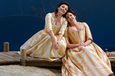 Jde o letitou inscenaci americké režisérky a asistentky Lesley Koenig, která se v Met etablovala od roku 1983 jako režisérka znovu a znovu obnovovaných nebo odjinud přenesených inscenací Ponnellových, Schenkových nebo Zeffirelliho. Od těchto mistrů operní režie se naučila respektu ke scénickým poznámkám, které v Così fan tutte, její první samostatné režii v Met, oddaně, ovšem pouze fádně ilustruje. Nic víc. Jsme skutečně na písčité pláži s plachetnicemi v pozadí, v neapolském domě sester s koutkem pro služku, která ze šňůry sbírá usušené punčochy a na detailně vyvedených kamnech míchá čokoládu, na pěkné travnaté zahradě s dvěma křesílky, na zahradě na břehu moře a tak dále a tak dále. Nejvytíženějším kusem „nábytku“ je nápovědní budka, která slouží coby sedátko, stupátko, případně odkládací stolek.