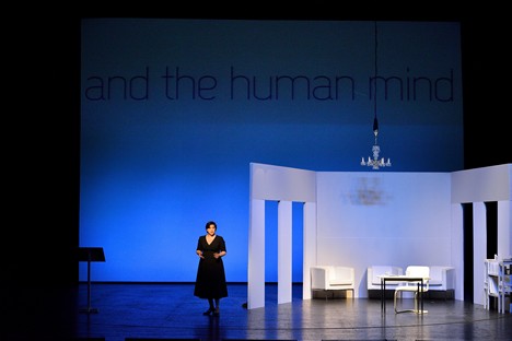 Jednoduchá scéna je tvořena třemi zdmi pokojíku, kde Steinová přemítá o svém tématu – od mluveného projevu přechází do zpěvu a zase zpět k mluvě v dialogu s houslistkou (vynikající Pauline Kim Harris) nebo hobojistou, které doplňuje sada bubnů a dřev. V pokojíku jsou tři křesla, stolek a knihovnička. V průběhu opery se objeví tři muži (tenorista Marty Coyle, barytonista Jeffrey Gavett a basista Adrian Rosas) v oblecích s kravatami a s klobouky na hlavách – aby se Steinové úvahami souhlasili nebo s ní polemizovali. Některé teze Steinové přednášky jsou promítány anglicky v různých grafických úpravách písma na zadní horizont.