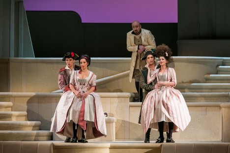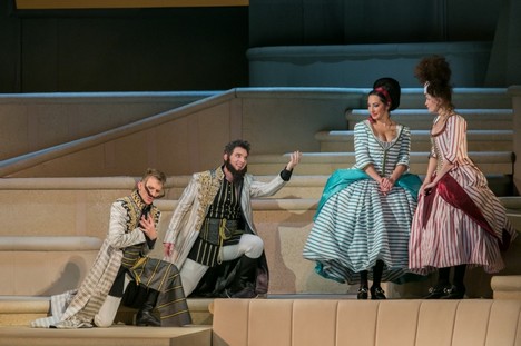 Jiří Menzel se decentně zaměřil právě na tuto úroveň příběhu. Tuto koncepci posilovala chladná šedobílá scéna scénografa Státní opery Gergelyho Zöldy, sevřená po obou stranách překližkovými „maketami“ rozevřených divadelních opon, které v zužující se perspektivě ubíhají v řadě za sebou, snad aby navodily pocit, že „jeviště světa“ nelze rozekrýt beze zbytku – po zvednutí jedné opony se objeví jen další. V tomto „oponovém“ koridoru je jeviště vertikálně rozčleněno do třech úrovní, propojených šikmými „chodníčky“ nebo schody. Menzel využíval všechny úrovně jeviště a dění doplnil i dalšími nezpívajícími postavami, hlavně eroticky vyzývavými půvabnými dívkami v baletních sukýnkách. A na „vojnu“ napochodovalo čtrnáct vojáků – v našich podmínkách sotva představitelné „plýtvání“ lidskými zdroji.Kostýmy Zimuly Sylvie Hanákové, jedné z našich nejžádanějších kostýmních výtvarnic v divadlech, televizi i filmu, mají historizující prvky, odpovídající italské módě osmnáctého století – převažují jasné barvy, především bílá.