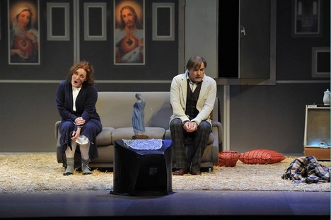 Také v záhřebské Pastorkyni jsme byli svědky značného posunu charakteru postav. Jenůfa v podání Tamary Franetović Felbinger se rozhodně nenesla „jak holba máku“ – rozcuchaná a shrbená ve vytahaném svetru měla k „pěknosti“, z níž se „hlava mate“, hodně daleko i tím, že její zvučný soprán, kdy uplatňovala především forte, postrádal měkčí lyričtější vrstvy. Navíc vedle Dubravky Šeparović Mušović, relativně mladé vysoké vyzáblé Kostelničky, vypadala starší. Taková Kostelnička sice vzbuzovala respekt a z její „zpovědi“ ve druhém dějství s použitím sprechgesangu probleskovaly silné momenty. Ukázalo se však, že tato pěvecká technika měla zakrýt nepříjemné najíždění na tóny. Odpudivý charakter Kostelničky až do krajnosti posilovaly válející se lahve od „chlastu“ v obýváku vedle sedačky i na jídelním stole kolem sochy Panenky Marie. Takový posun od „přísné ženské“, která nabádá Jenůfu, aby si pro takového „slotu opíjavého“ nelámala hlavu, k notorické alkoholičce, je hodně divoký.