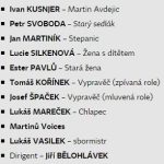 Činoherci – Tomáš Bambušek, Jiří Černý, Vanda Hybnerová, Petr Krušelnický, Jan Lepšík, Johana Matoušková, Passi Mäkelä, Richard Němec, Zuzana Sýkorová, Halka Třešňáková, Miloslav Mejzlík