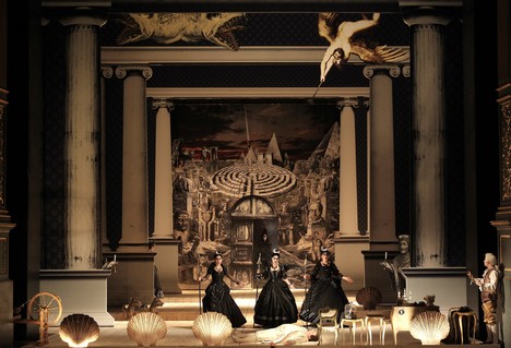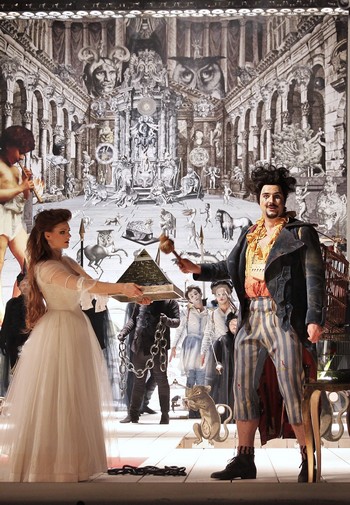 Alespoň nějaké rozptýlení nabídlo řešení scény Miroslava Huptycha a Martina Ondruše na barokním principu výměnných zadních prospektů. Jsou napnuty mezi sloupy, které se sbíhají místo v „božím“ nekonečnu, jak bychom mohli odtušit z doplněných úvodních textů, u zadních omlácených dveří jeviště Stavovského divadla. „Mašinérie“ prospektů je pomalována brueghelovsko-surrealistickými kolážemi včetně Mozarta s papouškovským tělem, Shakespeara s tělem Pegase, létající rybou nebo trojokými slony s křídly místo uší, kostlivci i astroláby a různými zednářskými symboly. Aby toho nebylo málo, na scénu se promítá zrnění jako ze starého filmu. Jenže i přes pyrotechnické efekty, rozsvěcování a zhasínání hlediště je výsledkem jen inscenace o staticky toporných figurách v krásných kostýmech, které se ztrácejí před hustě pomalovanými prospekty, když přijdou na jeviště zazpívat noty – lépe či hůře, rychleji či pomaleji.