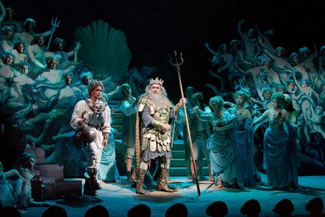 Protože půvabná Mirinda už dorostla věku na vdávání, rozhodne se Prospero zajistit jí ženicha s postavením a bohatstvím – nepolského prince Ferdinanda (Anthony Roth Costanzo). Když je přesvědčen, že Ferdinandova loď rovna pluje kolem ostrova, přikáže Arielovi vyvolat bouři, aby princ ztroskotal a ocitl se v náručí Mirindy coby zachránkyně. Ariel ale omylem potopí jinou loď, která do děje připlula z Shakespearovy komedie Sen noci svatojánské. Na Prosperův ostrov jsou tak postupně vyplaveny dva čerstvé manželské páry, které se vydaly strávit plavbou rokokové líbánky: Helena (Layla Claire), Hermia (Elizabeth DeShong), Demetrius (Paul Appleby) a Lysander (Elliot Madore). Očarováni Arielem tápou nad tím, koho vlastně milují. Celý propletenec nakonec po vzoru barokních oper jako deus ex machina vyřeší bůh Neptun, do jehož podmořské říše v modelu potápěčského skafandru jako z verneovek pro radu o pomoc dorazí i Ariel. „Třešničkou“ na barokní paštice – dortu se tak stal Plácido Domingo v roli už trochu mrzutého vládce moří, který nepochopí, že vyšňořené Sykorax při nápravě Prosperem spáchaných křivd nejde ani o bohatství, ani o moc, ale jen a jen o snahu vznítit Prosperovo dřívější milostné vzplanutí. Legendárního barda, který navíc slavil navíc v den přenosu 71. narozeniny, diváci nadšeně vítali sotva se objevil na jevišti, aniž ještě zazpíval jediný tón.