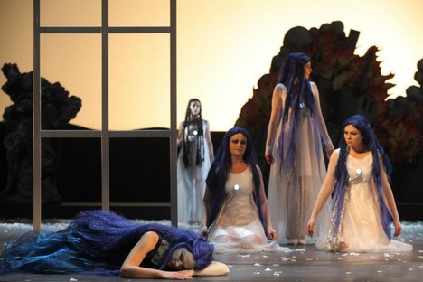 Pavla Vykopalová vzala až příliš doslova charakteristiku zrazené vodní žínky – s modrými dlouhými vlasy ve stříbřitých splývavých šatech – jako bytosti chladné a nesmělé. Důsledkem bylo, že v tom neustálém hemžení, které ještě posilují rokokoví chlapečci coby sloužící, polonazí mužové s nádobami s ohněm či vzorně vyšňoření lovci, a scénických proměn se její „mysterium o lásce, prohře a spasení“ vytrácelo. Vykopalové hlas je ovšem vyrovnaný, zní příjemně, ale chybí mu přesvědčivější vyjádření emocí. Ty v podobě dívčí rozpustilosti projevovala trojice vodních žínek cupitajících po špičkách s pohyby rukou podobných rybím ploutvím, ovšem k sezpívanosti měly hlasy Terezy Merklové Kyzlinkové, Jany Wallingerové a Radky Hudečkové daleko. Na závěr Černý kentaur (Ježibaba) vrátí Gandalofovi (Vodníkovi) jeho neonovou tyč, Rusalka za polibek Princovi dostane „odměnou“ nad hlavu královskou korunu, do popředí přicupitá Rusalka – teenager jako další adeptka koloběhu pokusů získat lidskou lásku, indický fakír zase zaujme stejnou polohu na zádech jako na začátku a po třech a půl hodinách hudebního trápení konečně padá opona vyvedená jako ozdobná utěrka v kuchyních našich prababiček s výšivkou nápisu „Bůh tě pomiluj“.