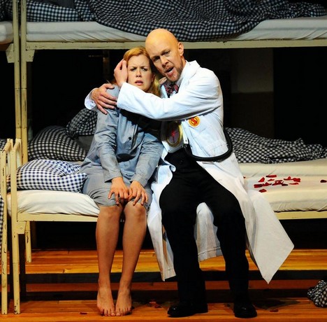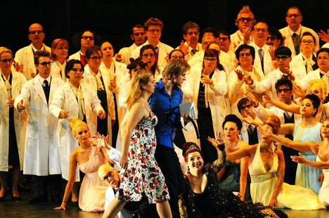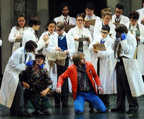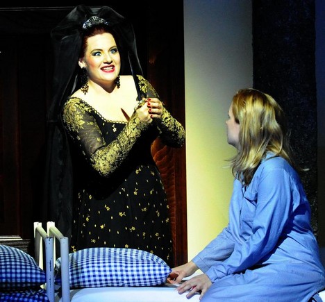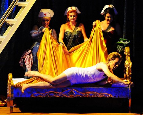 Panovačná žensky energická Královna noci (Mandy Fredrich s dramatickými koloraturami až na hranici svých možností), v blyštivé velké večerní, byla obklopena afektovanými hysterkami, ovšem s vyrovnanými a sezpívanými hlasy Sandry Trattnigg, Anjy Schlosser a Wiebke Lehmkuhl. V čepcích zdravotních sestřiček vstupují do snu překvapenému mladíkovi v bílém tílku a trenýrkách.