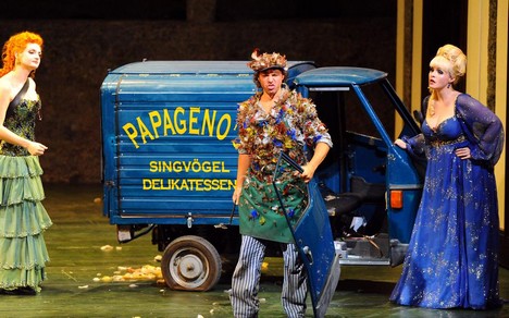 Pak jdou s celým zástupem koupěchtivých „hausfrau“ v zástěrách a s košíky obstarat ptačí delikatesy, které v tříkolovém mopedo-autíčku typu Ape nabízí zavedená a žádaná Papagenova pojízdná „masna“. Její majitel v podání Markuse Werby na sebe svým rošťáckým projevem s průrazným barytonem oprávněně strhával pozornost.