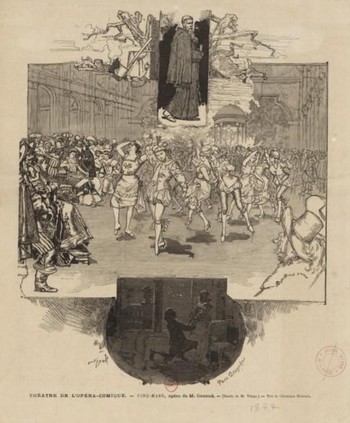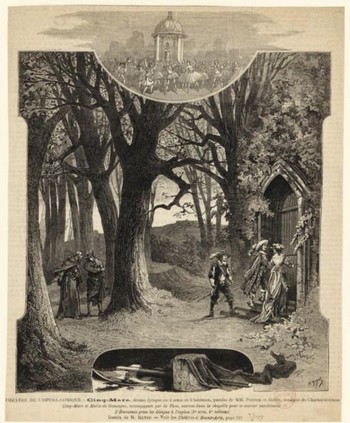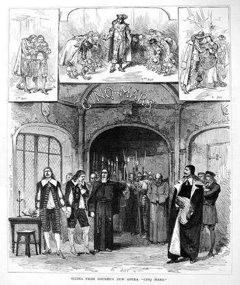 Základní zápletka libreta sice pozoruhodně věrně sleduje uvedený průběh neúspěšné revolty proti kardinálu Richelieu, ale doplňuje ho o milostné dobrodružství Cinq-Marse s princeznou Marií de Gonzague. Zatímco u Vigniho se markýz především touží princezně společensky vyrovnat, zamilovaný operní hrdina se pouští do konspirace z důvodu zabránit chystanému Mariinu sňatku s polským králem. Kromě řady dalších historických osobností se ve Vigniho novele i Gounodově opeře objevuje zajímavá postava, která by neměla být operním znalcům neznámá. Proslulá kurtizána Marion Delorme (1613 – 1650) inspirovala vznik dramatu se svým jménem v názvu Victora Huga, a o jeho zhudebnění se následně postarali Amilcare Ponchielli či Giovanni Bottesini.