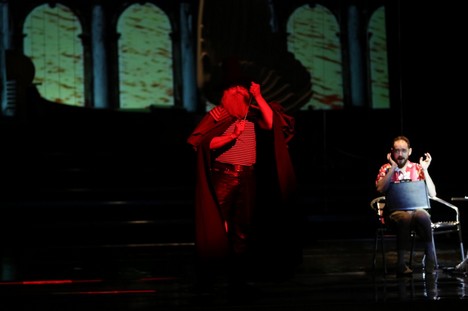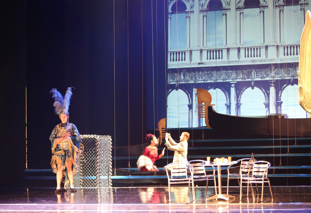 Hlavnou postavou opery je samozvaný kráľ Teodor, podvodník, ktorému naletelo mnoho ľudí a rôzne dobrodružstvá prežil aj v Benátkach. Obsahy opier nebývajú súčasťou mojich recenzií a ostávam tejto zásade verný. Ako predlohu prečítali bratislavskí inscenátori? Režisérka Lenka Horinková v nej hľadala paralelu medzi súdobou a súčasnou aktuálnosťou témy. K cieľu, už vo svojom zárodku dosť pritiahnutom za vlasy, sa nekráčalo ľahko. Ale áno, podvodníci a mamonári boli, sú aj budú. Lenže príbeh je natoľko schematický, hlúpučký a vykonštruovaný, že hoci len staviť na akúsi moralitu v podtexte, alebo ju aj ironizovať, je skôr fantazmagória. Pochopiteľne, táto výkladová niť sa režisérke pretrhla. Nepomohla ani štýlová dvojakosť kostýmov (navrhnutých Martinom Kotúčkom), keď prišelcov odela do moderných šiat a Benátčanov do historických. Vraj preto, lebo príbeh zasadila do karnevalového obdobia. Tomu však na statickom, fantázie zbavenom a na hranici gýča sa pohybujúcom javisku (scénograf Jaroslav Valek) nenapovedalo nič. Tapeta s obrazom mesta a štylizácia erbu bolo pramálo na to, aby vytváralo atmosféru, aby kulisy „hrali“ s príbehom. Zamýšľanú modernosť mal kamuflovať rad domodra vysvietených neónových trubíc, akási primitívna ilúzia kanálov s neustále sa presúvajúcimi loďkami. Všetko mala zavŕšiť potopa Teodora i Benátok, keď sa neóny zdvihli a nastúpila projekcia plávajúcich rybiek.
