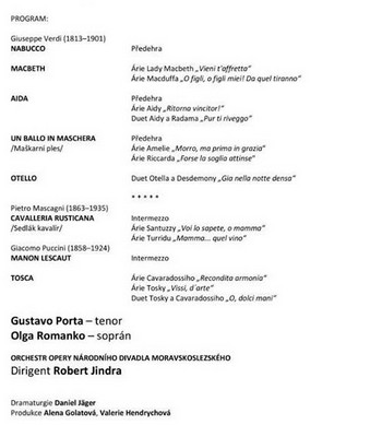 A propos orchestr. Pod taktovkou Roberta Jindry rozhodně nezklamal – i když úvodní předehra k Verdiho opeře Nabucco by přece jen chtěla lesk velkého symfonického tělesa. V dalších mezihrách se však orchest zaskvěl. K pocitu výjimečné kulturní události, kterou sledovalo plné Divadlo Antonína Dvořáka, přispěl i vzorově vybavený tištěný program. Závěrem lze jen dodat, že bude více než dobré vidět Olgu Romanko s Gustavem Portou i v příštích projektech ostravské opery.