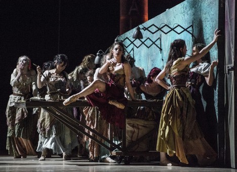 Priemet obrovských kariet „padá“ aj na ploche opony. Postupne sa pred nami odhalí veľkorysé námestie zdynamizované perspektívami (domy, socha, šikmý múr s roztrhanými plagátmi a sprayerskými nápismi, v pozadí sa črtá masívny komín z ktorého sa dymí) – to všetko v studenom nasvietení evokuje nevľúdne ráno, v ktorom sa robotníčky tabakovej továrne zhromažďujú na zmenu, vojaci majú svoje cvičenie a ktosi v okne vetrá náhlivo periny po spotenej noci. Otáčavým posunom diagonálne situovaného múru fabriky sa vyprofiluje interiér továrne, tesne nasekané stoly s tabakovými listami, rad lámp nad nimi.