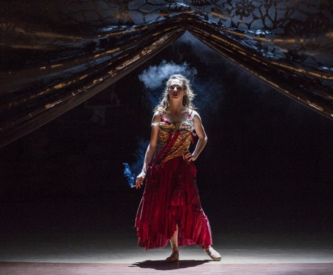 Na začiatku predstúpi pred nás Carmen nasvietená a poodhalená oponou, poťahuje si z cigarety a vykladá si karty, ktoré neveštia v jej osude nič dobré.
