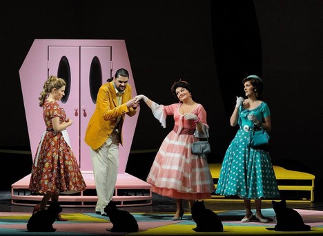 Hlavním problémem představení bylo velmi nediferencované vedení orchestru Markem Ivanovičem, který nerespektoval předepsané dynamické rozdíly partitury a bez velkých diferencí a v celkově silnější zvukové intenzitě odehrál jak lyrické, tak dramatičtější pasáže díla. Rafinovanosti partitury tak zcela zanikly. Částečně to mohlo být způsobeno i menším prostorem Stavovského divadla, ale delikátnost hudebního jazyka se opravdu nedostavila. Stejně tak herecké vedení (režie Jiří Nekvasil) bylo tzv. „na první dobrou“. Herecká akce bez větších nápadů byla odehrána spolehlivě, ale fádně. Režisér nepřivedl představitele (vyjma představitelky Mirandoliny a Rytíře di Ripafratty) k výraznějším charakterizačním úkolům. Situacím chyběla gradace a hlavně pointování. Chyběla i jakákoli režijní snaha vytvořit a dodržet typovost postavy. Scéna Daniela Dvořáka působí opticky fragmentárně a využívá povrchní symboliky (dvě torza klavírů, naddimenzovaná šachová figura věže a dveře). Tyto nesouvisející jednotliviny jsou kombinovány s křesly v designu padesátých let a stylově neutrálními židlemi. Zajímavě se jevily pouze figury koček na okraji scény, které snad měly evokovat ženské vlastnosti nebo odkazovat k původní inscenaci v Trösterově výpravě, jejíž atrakcí byla živá kočka, kterou na mašli vedly představitelky hereček. Stylově rozklížený dojem z inscenace, které celkově chybí elegance, posilují kostýmy Simony Rybákové. Současný zájem o módu padesátých let se již několik let opětovně vrací jako inspirační zdroj do kostýmní tvorby nejen operních scén (například La Rondine v Met, v Praze nejdůsledněji v Polském židovi ve Státní opeře). Práce s liniemi a materiály ale není důsledná, ženské kostýmy a doplňky (včetně materiálu „vikslajvantové“ kabelky) jsou uspokojivé a vizuálně vděčné, zatímco pánské kostýmy pracují již jen s náznakem pánských módních linií zvoleného období a kostým Rytíře di Ripafratty je současnou retrokopií. Barevnost pastelových tónů působila slibně, ale bohužel se s ní v inscenaci dále nepracovalo, ač se nabízely nápady křížové barevnosti křesel a oblečení nápadníků, kteří v herecké akci křižují jeviště. Katastrofálně působí baletní čísla, výtvarně zřejmě inspirovaná klipem „Mackie Messer“ v podání Miloše Kopeckého ze šedesátých let. Vystoupení bez obsahu, kdy tanečnice přijdou, protáhnou se a zase odejdou, ještě zarazilo nesychronicitou. Proč se saltarello (salterello = původně lidový abruzský tanec; s trochu jazykové licence přeložitelné i jako „skočná“) hrálo při zavřené oponě, mi zůstává záhadou, když už byl balet angažován.