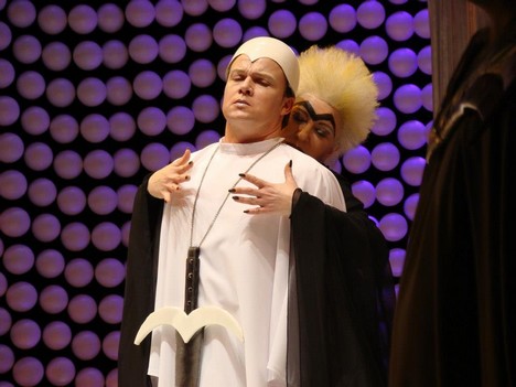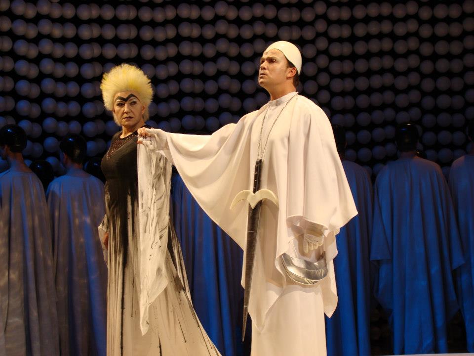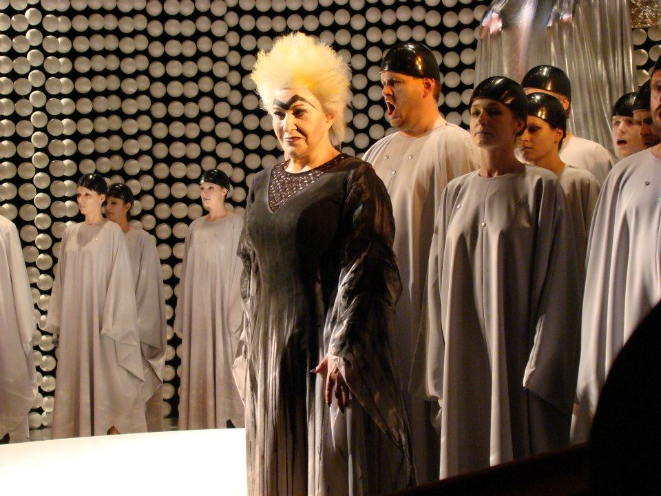 Hodnotit Roccovu inscenaci dva měsíce po její premiéře už považuji tak trochu za nošení dříví do lesa, tedy jen ve stručnosti. Mám pocit, že co do vztahů a motivací mezi postavami se Rocc dobral k více méně konvenčnímu řešení, což koneckonců sám přiznává i v rozhovoru, uveřejněném v programu: „…jsem vlastně zaskočen sám sebou, že nakonec vytváříme poměrně ‚klasickou‘ inscenaci. Nevytváříme žádné nové psychologické analýzy tohoto díla…“ Zpočátku mi však trochu vadila nedůslednost, s níž Rocc určuje pravidla na jevišti: stylizované dění na scéně je co chvíli vystřídáno zcela realistickou hereckou akcí, což působí mnohdy rušivě. Na druhou stranu nepochybuji, že takové pojetí nevzniklo z bezradnosti, ale bylo Roccovým záměrem. Nelze vyloučit, že pokud by scénu, kostýmy, pohyb a práci se znaky a symboly zcela sjednotil (což by jistě uměl), vyšel by z projektu tak trochu jako epigon Roberta Wilsona. Epigon, obklopený polystyrenem… Snahu Wagnerovo olbřímí a mnohdy značně statické dílo oživit děním, které z formálního hlediska není tak úplně předvídatelné, možná není bez půvabu, a Roccovi se to více méně daří. Lze si zvyknout i na kostýmy (opět Rocc ve spolupráci s Marií Vosmíkovou), oscilující od jednoduchého bílého oděvu pro Lohengrina přes šaty, určující svou barevností psychologické rozpoložení ženských hrdinek, až po jakousi parodii na odění současných politiků a úředníků, jež má Telramundově zbabělosti a manipulovatelnosti zřejmě přisoudit jistou nadčasovost. Výtečně funguje ve své jednoduchosti překvapivě variabilní scéna, vizuálně dobře působí i práce se symboly kruhu, půlkruhu a z něj vycházející jednoduchá silueta letícího ptáka. Za naprostý omyl subjektivně považuji pouze nápad s meči, jimiž se v případě nutnosti ohánějí Lohengrin, Telramund či Ortruda – mám za to, že inscenace by se bez takto konkrétních rekvizit obešla úplně. A pokud ne, nemusely by to být hračky z překližky, které činí svým nositelům nemalé obtíže při přepásávání či odepínání…