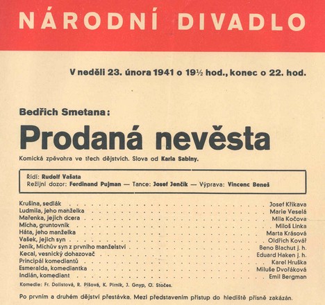Zpíval v inscenaci Prodané nevěsty premiérované 13. října 1938 (derniéra 13. srpna 1943); režisérem inscenace byl Hanuš Thein, scénografem Vincenc Beneš. Představení, které hudebně nastudoval Václav Talich, dirigoval Rudolf Vašata. Obsazení onoho únorového dne bylo následují: