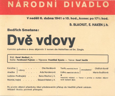 Pražská divadelní kritika se o jejich hostování v odpoledním představení 6. dubna 1941 hojně rozepsala. Dvě vdovy v režii Ferdinanda Pujmana a v hudebním nastudování Václava Talicha byly pod taktovkou hostujícího Karla Nedbala provedeny v tomto obsazení: