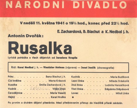 Rusalka v režii Hanuše Theina (po okupaci bylo jeho jméno na veřejnosti zamlčeno) a v hudebním nastudování Václava Talicha byla obsazena následovně: