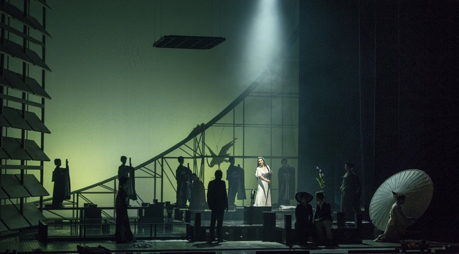 Příběh o třech generacích, který Heřman se svým týmem před diváka předkládá, se dočkal v našem tisku spíše pozitivního hodnocení (premiérovou recenzi jsme přinesli zde). To, jak již dospělý syn Cio-Cio-San a F. B. Pinkertona před začátkem opery nachází pozůstalost po své pravé matce a jak mu jeho rodiče celou operou tragický příběh vyprávějí, zatímco on operním dějem prochází, je podle mého soudu jeden z nejoriginálnějších operních výkladů (v dobrém slova smyslu). Snad jedinou slabinou Heřmanovy koncepce je přidaný zpěv námořníků na začátku opery. Jakkoli má zřejmě demostrovat rozdílnost americké a japonské kultury či snad to, že Pinkerton býval sám jedním z námořníků, je dost zbytečný. Odkazů na tento fakt je v libretu i hudbě opery dost. A navíc, jak ve své recenzi trefně napsala Věra Drápelová, Puccini věděl, jak zahájit operu. Tím ale výtky končí. Střet japonské a americké kultury byl ovšem patrný i o přestávkách, protože právě tito zahraniční hosté byli (mimo domácích) nejpočetnější skupinou v obecenstvu. Přišlo mi to celkem úsměvné…