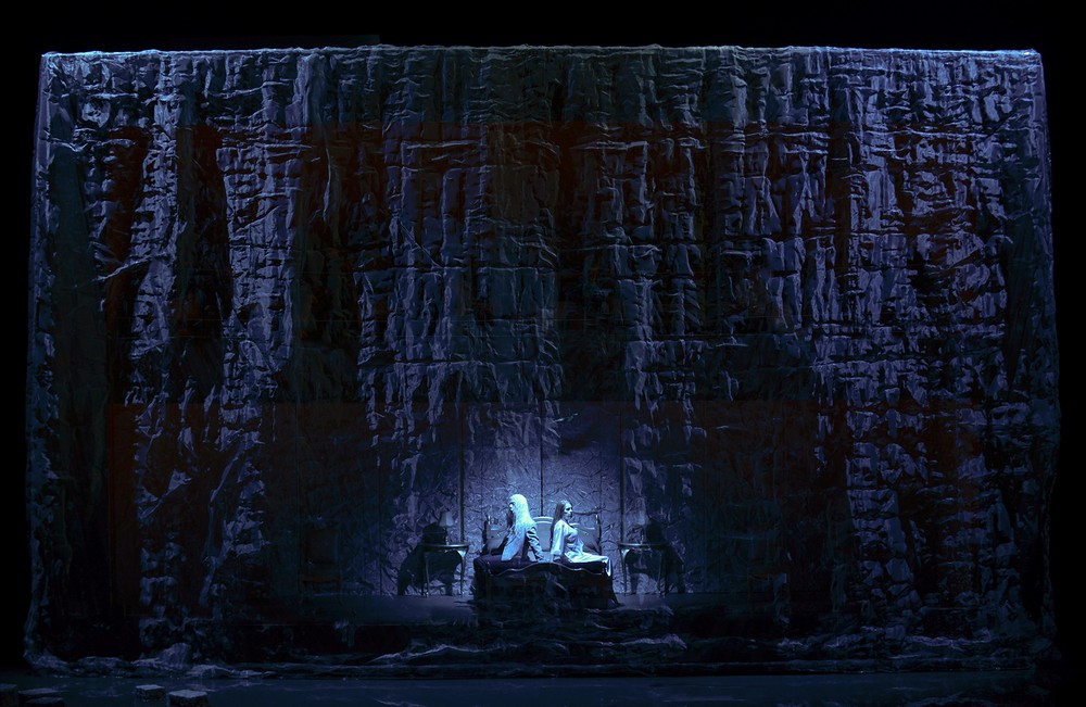 Při prvním otevření opony se objeví jevištní portál, jehož vrchní část je vytažena úplně nahoru, takže proscénium je neobvykle čtvercové. V přední otáčivé části jeviště se vlní skutečná vodní hladina, ve které se zrcadlí obrovská vysoká šedivá stěna. Ta je tvořena speciálním krepovým materiálem a znázorňuje ponurý hrad Allemonde. V podstatě je to konstrukčně veliký kvádr postavený na jevištní točně. Jeho vnitřek je zařízen jako prostorný dům o dvou patrech s řadou místností a schodišti. Pokud se děj odehrává na hradě, jednotlivé, nábytkem zařízené pokoje se vždy podle situace a těch kterých hereckých akcí nasvěcují. Někdy se celá stavba během děje natáčí a je vidět, jak jednotliví aktéři procházejí postupně prostory symbolického hradu.