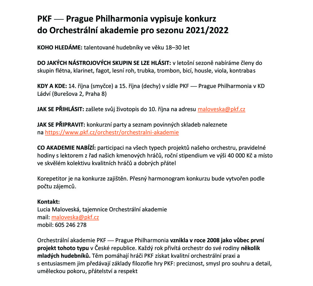 Inzerce PKF — Prague Philharmonia vypisuje konkurz do Orchestrální akademie Publikováno 28/09/2021 sdílejte: 0 minut čtení sdílejte: TémataSeznam inzerátů Sdílet článek Facebook email zkopíruj odkaz vytisknout sdílejte: Předchozí článek Operní panorama Heleny Havlíkové (337) – Svatá Ludmila na Dvořákově Praze jako vykonaná povinnost Další článek Týden s tancem 0 0 hlasy Ohodnoťte článek Odebírat Přihlášení Upozornit na nové a další komentáře nové odpovědi na můj komentář Label {} [+] Jméno* E-mail* Webová stránka Label {} [+] Jméno* E-mail* Webová stránka 0 Komentáře Nejstarší Nejnovější Most Voted Inline Feedbacks Zobrazit všechny komentáře Načíst další