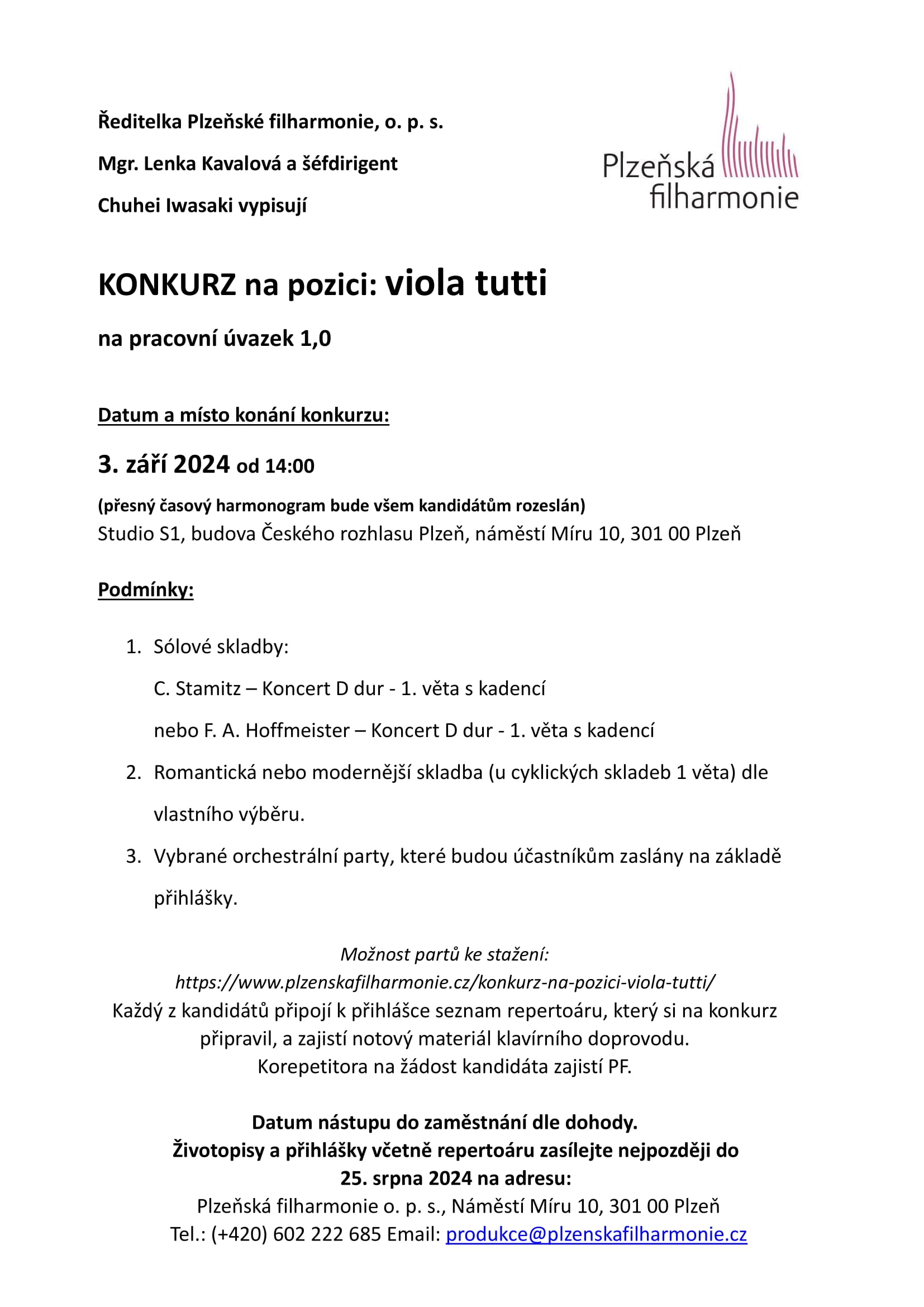 Inzerce Plzeňská filharmonie vyhlašuje konkurz na pozici viola tutti redakce Publikováno 05/07/2024 sdílejte: 0 minut čtení sdílejte: TémataSeznam inzerátů Sdílet článek Facebook email zkopíruj odkaz vytisknout sdílejte: Předchozí článek Finále festivalu TANEC PRAHA: Landfall Další článek Seznamte se: Matěj Rothbauer 0 0 hlasy Ohodnoťte článek Odebírat Přihlášení Upozornit na nové a další komentáře nové odpovědi na můj komentář Label {} [+] Jméno* E-mail* Webová stránka Label {} [+] Jméno* E-mail* Webová stránka 0 Komentáře Nejstarší Nejnovější Most Voted Inline Feedbacks Zobrazit všechny komentáře Načíst další