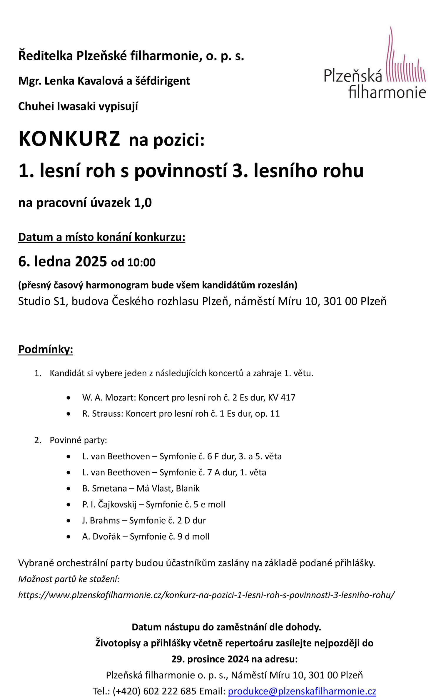 Inzerce Plzeňská filharmonie vypisuje konkurz na 1. lesní roh s povinností 3. lesního rohu Publikováno 04/12/2024 sdílejte: 0 minut čtení sdílejte: TémataSeznam inzerátů Sdílet článek Facebook email zkopíruj odkaz vytisknout sdílejte: Předchozí článek Druhý ročník benefičního gala Tancem pro život vynesl onkologickému ústavu 860 000 korun Další článek S Natašou Novotnou nejen o blížící se rezidenci v divadle PONEC 0 0 hlasy Ohodnoťte článek Odebírat Přihlášení Upozornit na nové a další komentáře nové odpovědi na můj komentář Label {} [+] Jméno* E-mail* Webová stránka Label {} [+] Jméno* E-mail* Webová stránka 0 Komentáře Nejstarší Nejnovější Most Voted Inline Feedbacks Zobrazit všechny komentáře Načíst další