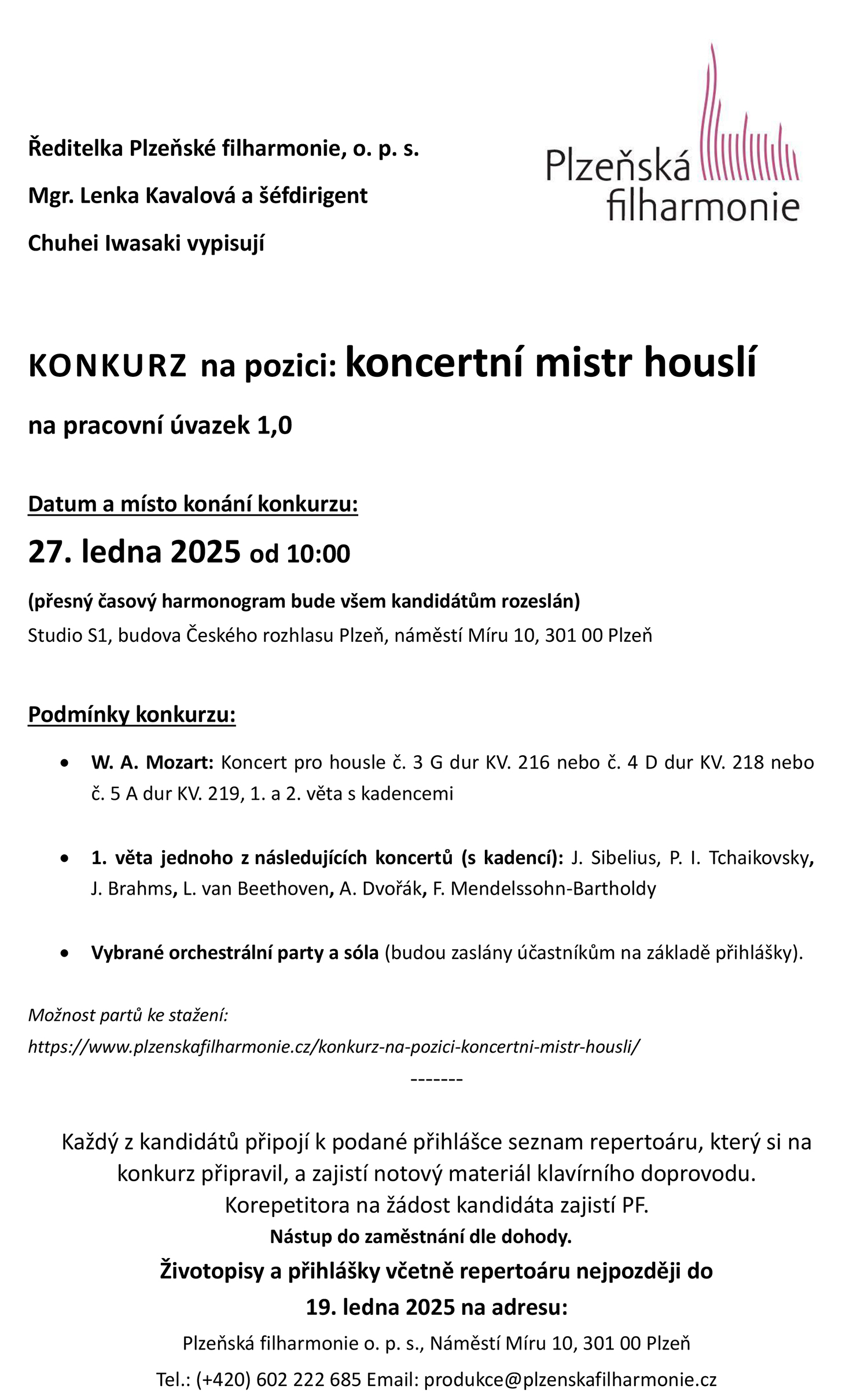 Inzerce Plzeňská filharmonie vypisuje konkurz na koncertního mistra houslí Publikováno 07/12/2024 sdílejte: 0 minut čtení sdílejte: TémataSeznam inzerátů Sdílet článek Facebook email zkopíruj odkaz vytisknout sdílejte: Předchozí článek Slovanské tance jako pohybové divadlo i koncert Další článek Tři koncerty, tři vyprodané večery: Mohla by Česká filharmonie hostovat v Carnegie Hall častěji? 0 0 hlasy Ohodnoťte článek Odebírat Přihlášení Upozornit na nové a další komentáře nové odpovědi na můj komentář Label {} [+] Jméno* E-mail* Webová stránka Label {} [+] Jméno* E-mail* Webová stránka 0 Komentáře Nejstarší Nejnovější Most Voted Inline Feedbacks Zobrazit všechny komentáře Načíst další