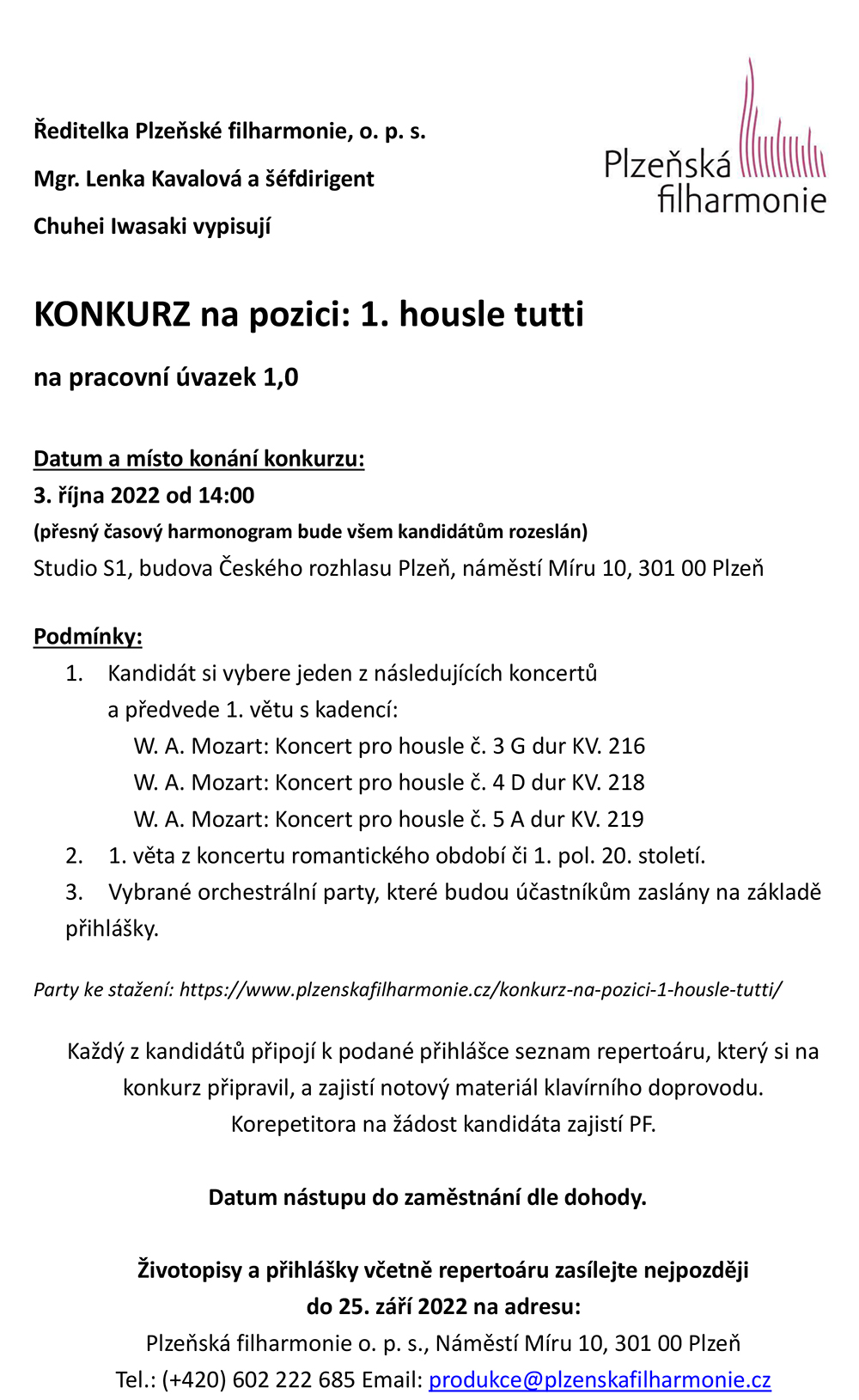 Čtení Plzeňská filharmonie vypisuje konkurz na pozici: 1. housle tutti