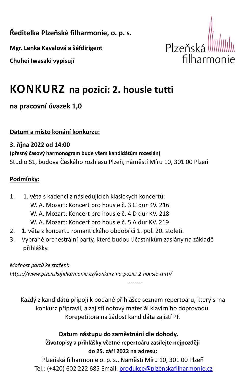 Inzerce Plzeňská filharmonie vypisuje konkurz na pozici: 2. housle tutti Publikováno 22/08/2022 sdílejte: 0 minut čtení sdílejte: TémataSeznam inzerátů Sdílet článek Facebook email zkopíruj odkaz vytisknout sdílejte: Předchozí článek Týden s hudbou. Koncerty, opera, TV Další článek Nový hudební ředitel Opery Národního divadla zahájí své působení Rusalkou a Věcí Makropulos 0 0 hlasy Ohodnoťte článek Odebírat Přihlášení Upozornit na nové a další komentáře nové odpovědi na můj komentář Label {} [+] Jméno* E-mail* Webová stránka Label {} [+] Jméno* E-mail* Webová stránka 0 Komentáře Nejstarší Nejnovější Most Voted Inline Feedbacks Zobrazit všechny komentáře Načíst další