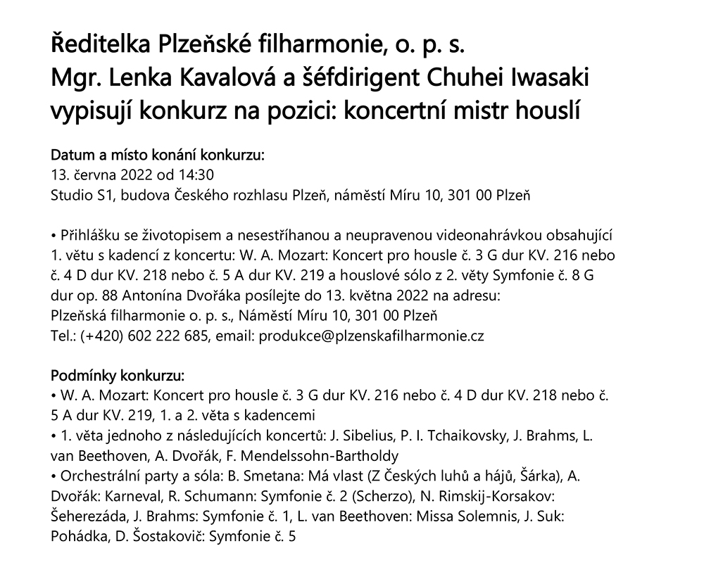 Čtení Plzeňská filharmonie vypisuje konkurz na pozici: koncertní mistr houslí
