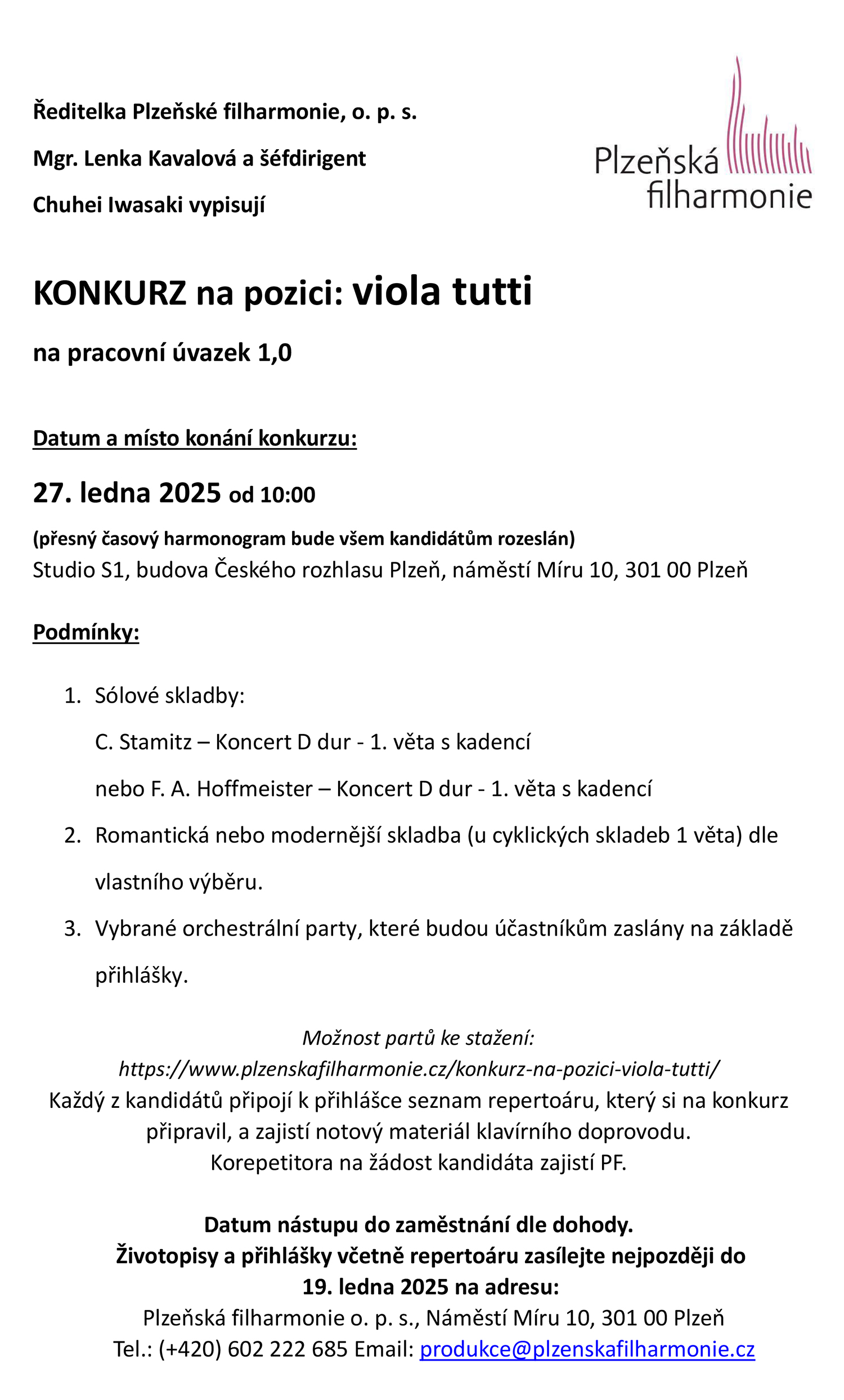 Inzerce Plzeňská filharmonie vypisuje konkurz na violu tutti Publikováno 09/12/2024 sdílejte: 0 minut čtení sdílejte: TémataSeznam inzerátů Sdílet článek Facebook email zkopíruj odkaz vytisknout sdílejte: Předchozí článek Australský režisér Barrie Kosky dnes převezme Cenu Antonína Dvořáka Další článek Premiéry Bohemia Baletu na pokračování: Láska k tanci vítězí 0 0 hlasy Ohodnoťte článek Odebírat Přihlášení Upozornit na nové a další komentáře nové odpovědi na můj komentář Label {} [+] Jméno* E-mail* Webová stránka Label {} [+] Jméno* E-mail* Webová stránka 0 Komentáře Nejstarší Nejnovější Most Voted Inline Feedbacks Zobrazit všechny komentáře Načíst další