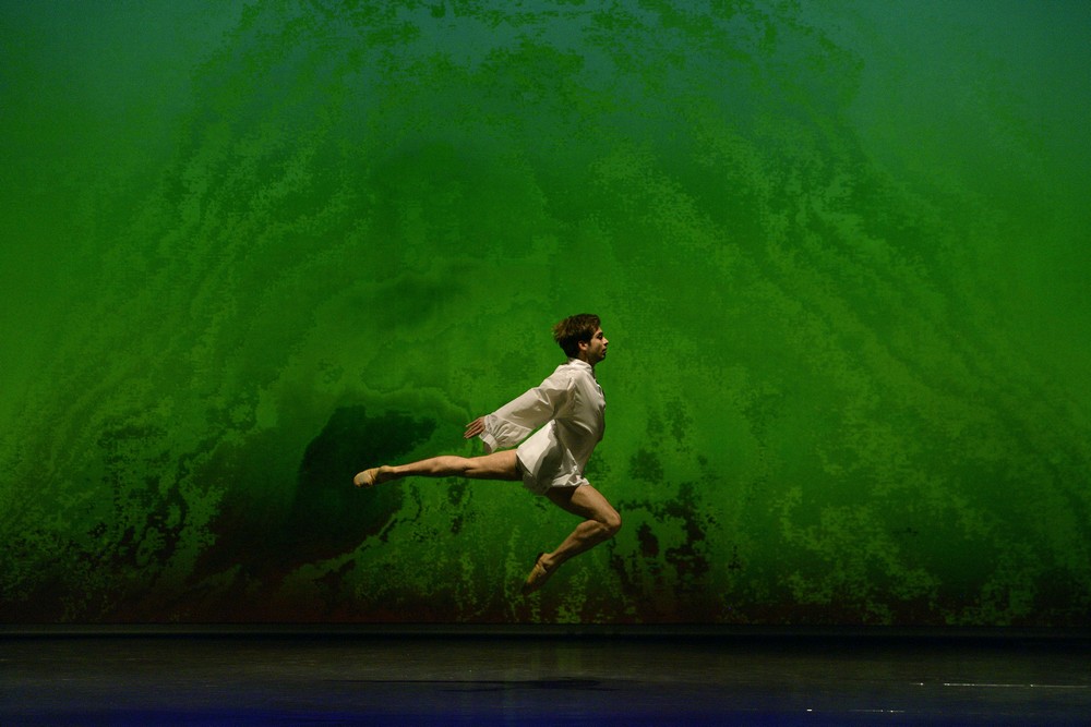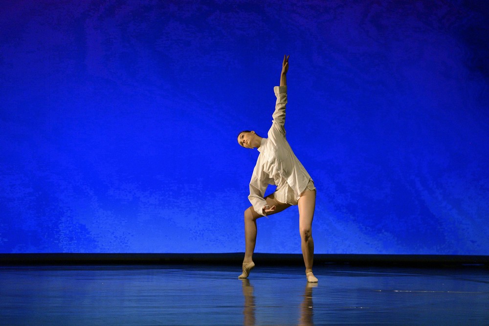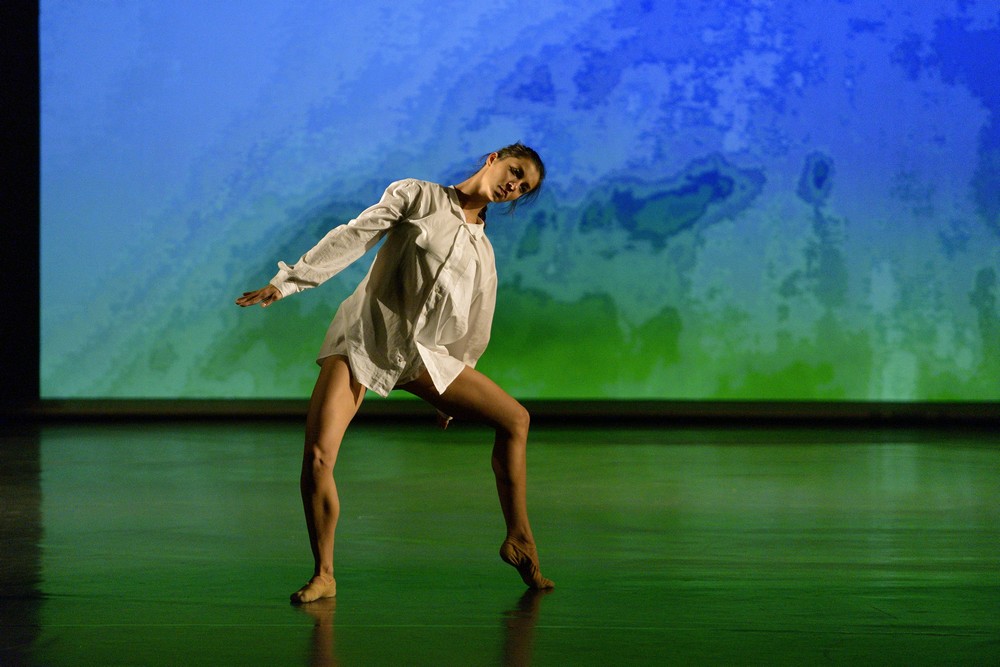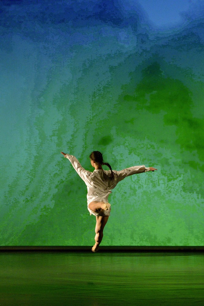 Na jeviště z postranních výkrytů postupně po jednom, po dvou i s menším odstupem ve skupinkách nastupují tanečníci – ženy i muži. Mají bosé nohy a překrývají je zlehka bílé lehké košile s dlouhými rukávy, které pohyb paží částečně dohrávají. Jen jeden tanečník má civilní šaty a bekovku.