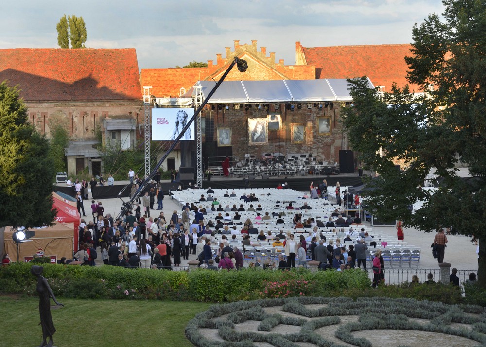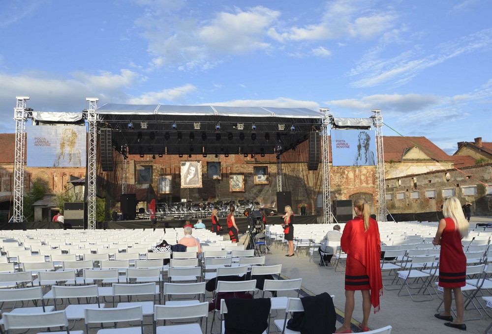 Skutečnost ale byla zklamáním: trapné dělení hostů podle výše vstupenek na VIP a na „ty ostatní“, kterým byl přístup k zámku a kamkoli mimo arénu zapovězen, se podepsalo na celkovém dojmu z akce.Už parkování na konci vesnice ve skladišti „toi-toiek“ působilo zajímavě, a to jsme netušili, že je nevidíme naposled. Dějištěm koncertu nebyl zámecký areál, ale značně zdevastovaný dvůr velkostatku, s budovami bez omítek, napůl zborcenými střechami, z nichž trčely trámy, prostě pohled, jako by odtud teprve před pár dny odstěhovali zrušené Jednotné zemědělské družstvo. Kdo si vzal na tuto kulturní událost oblek, musel se tu cítit poněkud nemístně. V jedné ze stodol se v obrovské kaluži čehosi tekutého tísnily naše známé plastové kadibudky, které tvořily hygienické zázemí pro tisíc návštěvníků. Opravdu se pro galakoncert připravovaný tři roky nedalo vytvořit vhodnější prostředí?Naštěstí vše zachránil hudební program tvořený skutečnými profesionály. V akci se angažoval Jiří Bělohlávek, který přijel do Litně s orchestrem PKF – Prague Philharmonia, aby na pódiu doprovodili čtyři sólisty: Martinu Jankovou, Dagmar Peckovou, Štefana Margitu a Adama Plachetku.První část večera patřila Mozartovi a Jankové s Plachetkou. Po předehře k Donu Giovannimu zazněla árie Guglielma Donne mie, la fate z Così fan tutte. Adam Plachetka zpíval s lehkostí, i když ozvučení mu do hlasu přimísilo trochu ostřejší tón. Martina Janková přednesla něžným chvějivým sopránem pomalou, procítěnou a bohatě ornamenty zdobenou árii Aminty L’amero, saro constante z opery Il re pastore.V orchestrálním doprovodu árie se vyznamenal mimo jiné koncertní mistr PKF – Prague Philharmonia zdařilým houslovým sólem. Ve společném duetu Papagena a Paminy Bei Männern, welche Liebe fühlen z Kouzelné flétny popustil Plachetka uzdu svému mužnému basbarytonu a rozezpíval jej plnou silou, zatímco Janková zářila jasnými výškami. PKF – Prague Philharmonia pak precizně a svižně „vystřihla“ předehru k Rossiniho Hedvábnému žebříku, oblíbená vsuvka pěveckých galakoncertů vždy zvedne náladu. Na závěr „mozartovského“ bloku si Adam Plachetka ponechal efektní árii Dona Giovanniho Fin ch’han dal vino, zazpíval ji se šarmem a nadhledem, a závěr árie v rychlém tempu, kde všichni zpěváci sekají takty a lapají po dechu, vyřešil jako jednolitou finesu na jeden nádech. Jak prosté, když to někdo umí, že… Plachetka je prostě rozený Giovanni, stačí se na něj podívat – vysoký, tmavovlasý, pohledný. Je prototypem úspěšné operní hvězdy.Uprostřed koncertu si vzal slovo Jiří Vejvoda a svým nenapodobitelně patetickým stylem uvedl několik kapitol ze života Jarmily Novotné za promítání fotek z jejího archivu. Na této části večera se jako režisér podílel Michal Caban, a popravdě řečeno, čekala jsem od toho víc. Výběr portrétů, fotek z rolí a ukázek z filmů, v nichž Novotná hrála jako herečka, také snímky s politiky jako Tomáš Garrigue Masaryk, Jan Masaryk a Václav Havel, vše úctyhodné, reprezentativní, oslavné, nicméně jako člověka nám ji to příliš nepřiblížilo. S jedinou opravdu milou osobní poznámkou, že nejradši měla psy. Její zarámované portréty ve vznešených historizujících róbách, zavěšené nad pódiem, jako by ani nepatřily k ženě, která žila až do roku 1994 v New Yorku.