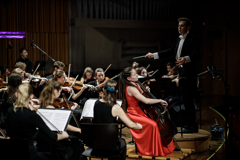 Pojítkem mezi vyzněním instrumentálních koncertů na programu byla dynamická vyváženost mezi party orchestru a sólistů. I v druhé polovině koncertu tak bylo možné naplno vychutnat technicky i výrazově vyspělou hru Karolíny Žákové, studentky 5. ročníku ve třídě profesora Miroslava Petráše, jejíž mladé umění nese dle mého názoru všechny tři atributy, jimiž by se hra dobrého violoncellisty měla vyznačovat: schopnost projekce, plnost tónu a zpěvnost kantilény. Dalším příjemným rysem hry slečny Žákové je její duchapřítomná „stage presence“. Ta se v pondělí projevovala příkladnou komunikací s dirigentem. Na adresu sólistky si dovolím snad už pouze jedinou úvahu, a to nad frázováním prvního tématu třetího oddílu (tempo primo) tohoto jednovětého koncertu (označeného tempovým předpisem Un peu moins vite). Skladatel zde indikuje typ frázování spíše ve smyslu technického rozdělení smyku do menších tónových celků. Otázkou je, zda by zde hudba nemohla profitovat z velkorysejšího přístupu ke stavbě fráze v podobě déle klenutého melodického oblouku. Toto je však interpretační rozhodnutí ovlivňované mnoha faktory, od čistě technických (například velikost intervalů, vztah dynamiky k délce smyku) až po filozofické (přesnost dodržení notového zápisu), a rozhodnutí slečny Žákové je třeba plně respektovat.