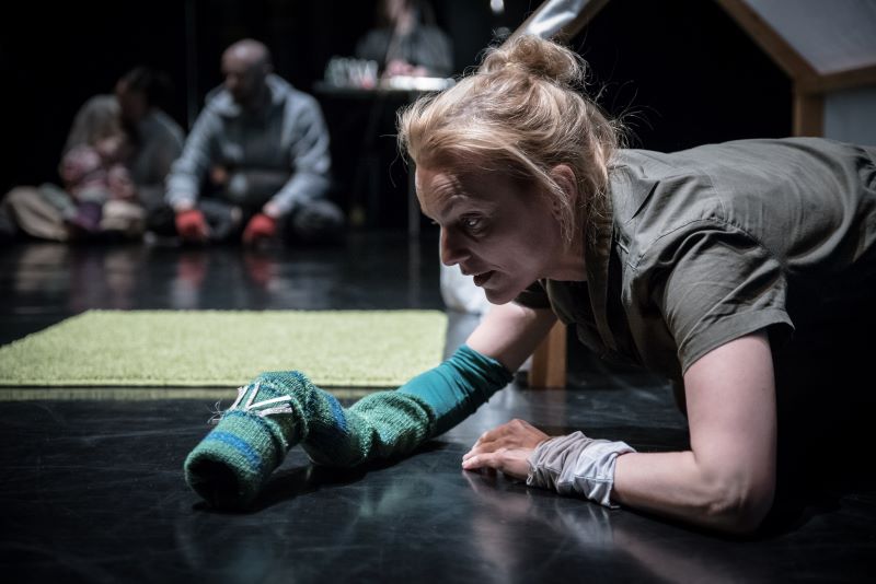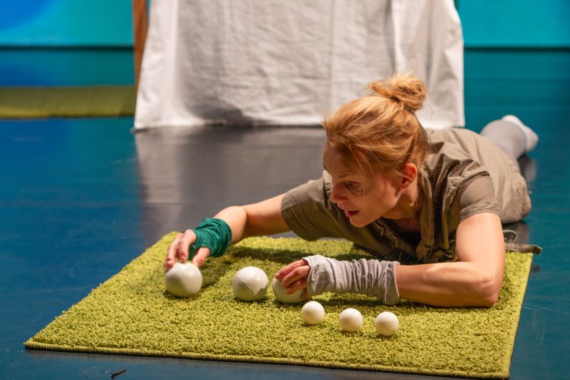 Modrá značí vodu, tu potřebuje hmyzí říše také, i když se před deštěm schováváme. Bzučení přiláká další děti, ale to už si jedna z performerek pohrává s neviditelnou mouchou. Největší úspěch má ale vždy housenka, i když právě na tohle stádium hmyzu pak máme jako dospělí zahradníci nejvíc spadeno… V inscenaci má nezastupitelné místo při tvorbě hmyzí říše i obratné loutkovodičství. A pro děti je skutečné vše, i vypoulené oči, i ponožkový maňásek, chlupatá housenka i nenasytná larva ztvárňovaná performerkou, která se zřejmě chystá kuklit, a proto se potřebuje hodně najíst.