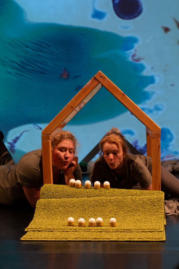 Na jevišti je totiž ještě šero jako za úsvitu, když se ozvou první zvuky a děti tiše přihlížejí, když se objeví performerka i první hmyzák maňásek. Pingpongové míčky evokují hmyzí vajíčka, která je potřeba ochránit. Hmyzí svět ožívá i za jednoduchých zvuků, cinkotu a krátkých melodických sekvencí, které určují tep představení. Děti pozvolna začnou reagovat a mohou se zapojit, povzbuzovány performerkami. Malé diváky fascinuje hra s růžovou housenkou na honěnou a cvičení nebo oči na stopkách, které zpoza hmyzího domku vystrkuje možná hlemýžď. Projekci obstarává klasický meotar, není předtočená, vzniká tady a teď kapáním barev do vody, které vytvářejí na horizontu nejrůznější obrazce.