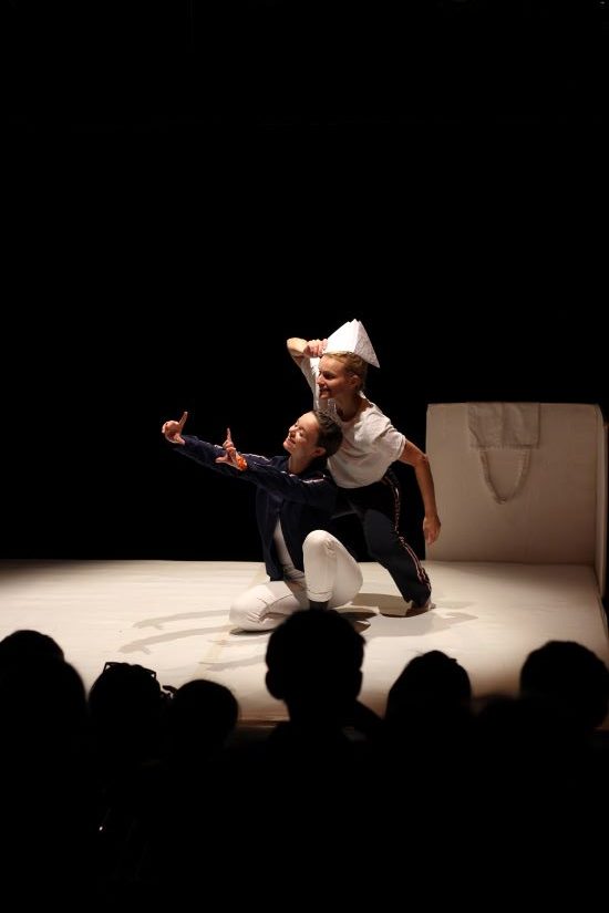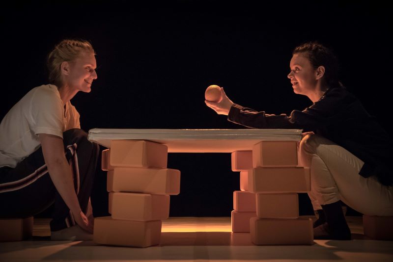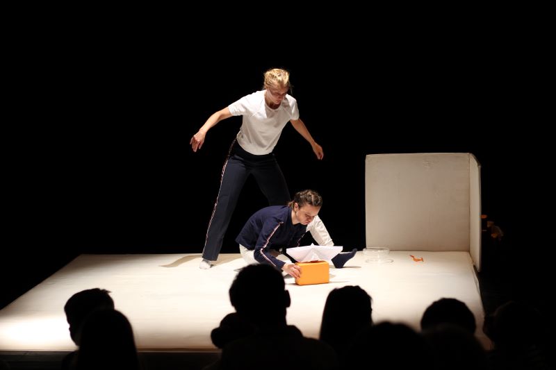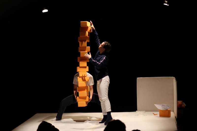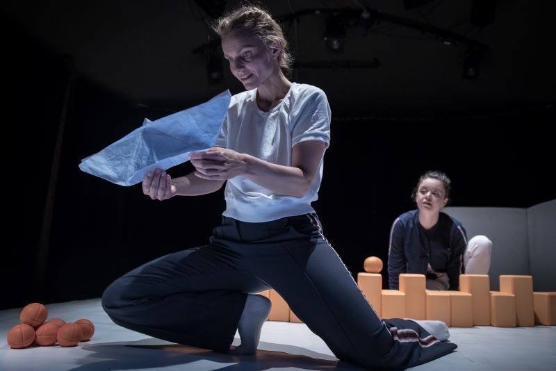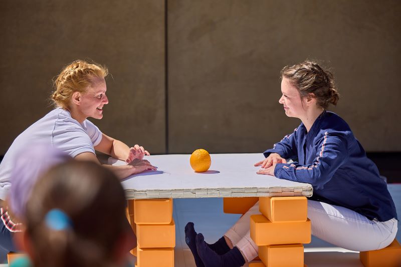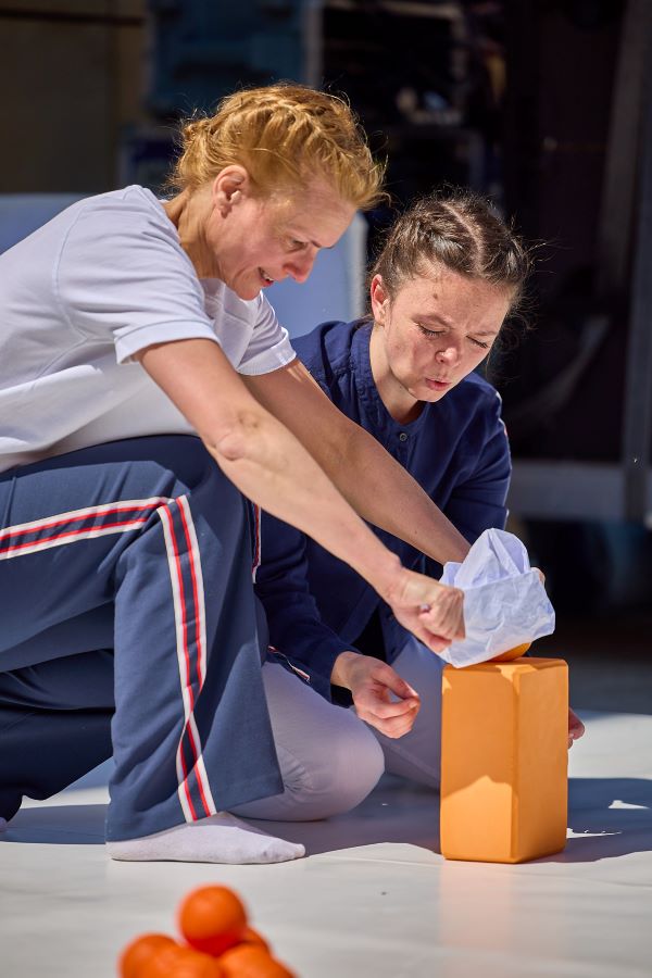 Prostor pomyslné paluby performerky Hana Strejčková (která je režisérkou inscenací) a Katarína Hudačková definují technikami pantomimy, jejich loď se chvílemi zmítá na vlnách a jindy ji samy transformují v lodičku papíru, kterou řídí jako hračku, aby se vzápětí změnila v motýla nebo ptáka. Klaunská podstata jejich figur se zase dostává ke slovu ve hře se samotným pomerančem. Od zvědavého objevování neznámého balíčku-dárku, přes prozkoumání vlastností rekvizity k zapojení žonglovacích míčků imitujících malé pomeranče, které se však tak trochu vzpírají a dělají si, co chtějí, když se je snažíte pochytat a uložit, mohou se však změnit třeba i v housle. (V něčem mi připomínají postavy klasických večerníků z 60. a 70. let, jejichž scénáře většinou stavěly na dvojicích hrdinů a jejich společném soužití a dobrodružstvích „všedního dne“, ty určené pro nejmenší diváky publikum byly často němé, a tedy musely být akce postav též animované na principech klaunérie.) Hraná nešikovnost vždycky vzbudí smích, ale pak přispěchá kamarád na pomoc. Učit se tak, aby člověk nezaregistroval, že se učí… to je nejlepší cesta.