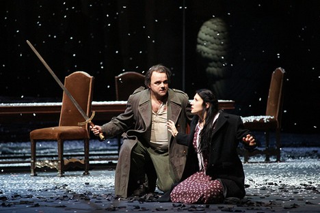 Po úvodním večeru Wagnerovy tetralogie Prstenu Nibelungova, Rýnském zlatě, které se představilo v listopadu loňského roku (naši recenzi najdete zde), uvedl operní soubor v Linci první slavnostní večer, Valkýru. Po své premiéře 22. března běží tato opera v sedmi reprízách až do června, pak se znovu objeví v příštím roce, kdy bude Ring již kompletní. Režií celého cyklu byl pověřen bývalý šéf operního domu v Kolíně Uwe Eric Laufenberg (od podzimu letošního roku nastupuje jako intendant Hesenského státního divadla ve Wiesbadenu). Jeho pojetí úvodního předvečera Rýnského zlata svým zasazením někam do arabských zemí Středního východu vzbudilo u diváků jistě hodně emocí a také zvědavosti na předvedení Valkýry v podobném stylu. Ale nebylo tomu vůbec tak. Žádné pouště arabského světa před mnoha stoletími, ale kraj středoevropského kontinentu v období mezi světovými válkami. V prvním dějství se dostáváme do pochmurného interiéru Hundingova domu, který je představen jako jakási hospoda s nálevním pultem, s pohybujícími se dvěma ženskými postavami navíc, samozřejmě kromě Sieglindy. Jsou to snad její sestra a Hundingova matka? Středem spodní rozsáhlé místnosti s loveckými trofejemi na stěnách a hospodským nálevním pultem prorůstá mohutný jasan, v jehož kmeni je zaražen meč Nothung.
