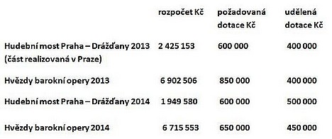 Na tento i předchozí rok jsme žádali v řádném grantovém řízení Ministerstva kultury odboru umění o podporu dvou koncertních cyklů: Hudební most Praha – Drážďany a Hvězdy barokní opery (tento cyklus od sezony 2014–15 bude probíhat pod názvem Collegium 1704 v Rudolfinu). Pro přehlednost si dovoluji nabídnout jednoduchý přehled pro roky 2013 a 2014: Jak tedy vypadá ono zázračné navýšení dotace, které inspirovalo snaživou investigativku k vytvoření bombastického titulku „Barokní“ tahanice o dotace vyhrál náměstkův soubor? Pro cyklus Hudební most Praha – Drážďany jsme oproti loňskému roku získali 100 000 Kč navíc a naprosto triumfální je zejména naše vítězství u projektu Hvězd barokní opery, kde se nám pro koncertní cyklus s téměř sedmimilionovým rozpočtem podařilo po lítém boji urvat o celých 50 000 Kč navíc. Škoda, že jsme se z článku nedozvěděli, s kým jsme se to vlastně tahali a nad kým že jsme to vyhráli. Zato se však dozvídáme, že naše dotace byla navýšena meziročně o 20 %. Ať počítám, jak počítám, dvaceti procent se nedopočítám… no ale to jsem zase u těch ošidných procent. Je třeba dodat, že úspěšných subjektů, jejichž příspěvek dle bodování odborné komise byl navýšen v takovémto nebo i větším objemu, jsou desítky, stejně jako jsou desítky těch, kteří mají letos příspěvek menší než v roce předchozím a v budoucím roce mohou získat příspěvek vyšší, jako se to děje opakovaně u všech (i našich) grantových žádostí, jejichž výsledky vycházejí jednak z bodování odborné komise a také z aktuálního rozpočtu schváleného pro oblast živého umění v daném roce. Na tom není nic neobvyklého… Tak to prostě u grantových řízení chodí. Nechávám na zvážení laskavého čtenáře, aby sám posoudil, zda jsou naše projekty ze strany Ministerstva kultury podezřele „přefinancované“.  Každopádně bych chtěl pogratulovat k výtečnému sólokapru deníku MF Dnes. Skvělá novinařina, řekl bych.  Autorka podepsaná pod článkem se rázem stala horkou kandidátkou na Cenu Ferdinanda Peroutky.