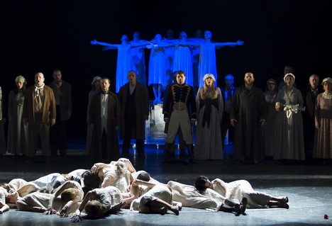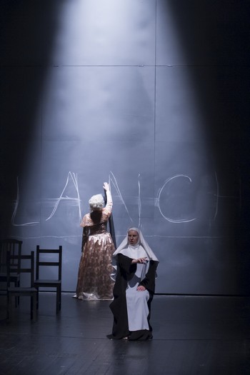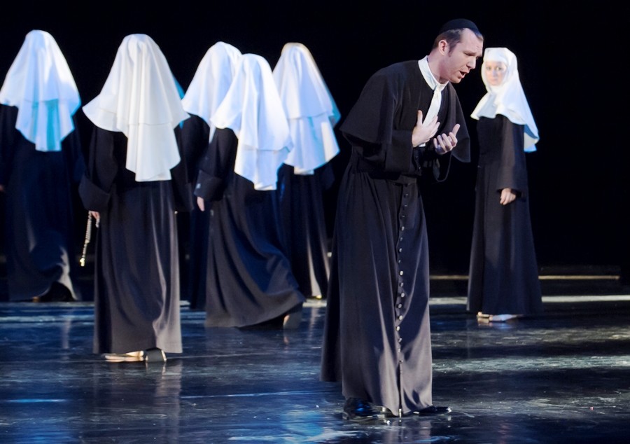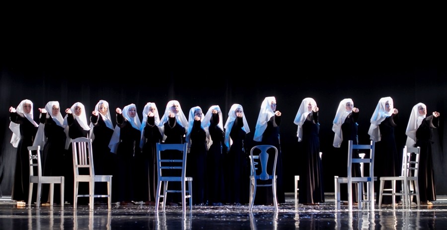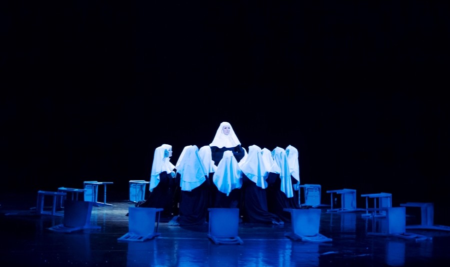 Košickému súboru patrí v prvom rade uznanie, že sa odhodlal popasovať s neľahkou úlohou a dobrovoľne si zdvihol latku vlastných kritérií. Opäť sa raz potvrdilo, že šťastie praje odvážnym. Celkový tvar inscenácie bol v každom ohľade akceptovateľný. Vizuálnu podobu formovala ženská ruka – a bolo to cítiť. Linda Keprtová stojí na začiatku kariéry (išlo o slovenský režisérsky a scénografický debut v divadle, kde od minulej sezóny pôsobí ako dramaturgička), no základné črty jej umeleckého profilu sú už pozorovateľné. K predlohe pristúpila s veľkou pokorou, nie však kapituláciou pred jej výzvami. Vzácna rovnováha hudby a slova, ktorú dosiahol Poulenc s Bernanosom, ju inšpirovala k poňatiu, podporujúcemu onú v partitúre zakódovanú symbiózu. Obe východiská rešpektovala, ani jedno z nich nepovažovala za dominantné. Kde prevláda naratívny tón, stavila na štylizáciu pohybu, aranžovanie pomocou „choreografie“ ľudského tela a vytváranie atmosféry svetelnou réžiou.