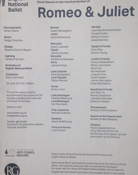 Balet Sergeje Prokofjeva Romeo a Julie, v němž se Daria Klimentová představila se svým současným tanečním partnerem Vadimem Muntagirovem, oficiálně ukončil pětadvacetiletou kariéru, během níž Klimentová jako první sólistka Anglického národního baletu působila osmnáct let.„Rádi bychom Darie poděkovali za její oddanost souboru během osmnácti let, které strávila s námi. Bude nám obrovsky chybět a každý ze souboru by jí rád popřál všechno nejlepší do budoucna,“ uvedl při příležitosti rozloučení se svojí primabalerínou Anglický národní balet na svých internetových stránkách.