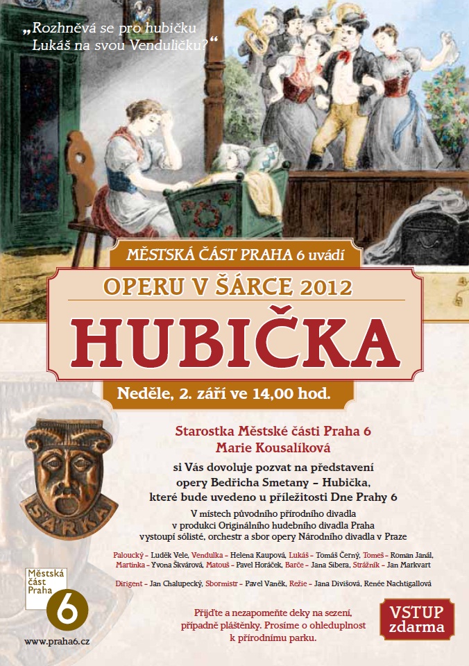 Opera pod širým nebem v pražské Šárce, která od poloviny minulého desetiletí získala velmi rychle ohromnou oblibu zdaleka nejen Pražanů, bude patřit i k letošnímu začátku září. Program je již jasný: v neděli 2. září 2012 bude šárecké údolí patřit Smetanově Hubičce. Tedy jednomu z dlouhé řady českých titulů, které v repertoáru naší první scény často po dlouhá léta chybějí. Protagonisty letošní Hubičky, která v novodobé historii pražské operní Šárky zazní poprvé, budou Helena Kaupová coby Vendulka a Tomáš Černý jako Lukáš, jako Tomeš se představí Roman Janál, v úloze Palouckého vystoupí Luděk Vele. Yvona Škvárová se vrátí k úloze Martinky, Jana Sibera se ujme role Barče, Matouše Pavel Horáček a Strážníka Jan Markvart. Ani dirigent nebude v Šárce žádným nováčkem – orchestr Opery Národního divadla v Praze bude řídit Jan Chalupecký, sbor Opery ND připraví Pavel Vaněk. O režii se již tradičně postarají Jana Divišová a Renée Nachtigalová.Na začátku nynější tradice šáreckých operních představení byla v roce 2005 Smetanova Prodaná nevěsta, s účastí kolem pěti tisíc diváků, na její další uvedení následujícího roku jich přišlo již sedm tisíc. V letech 2007 a 2008 se hrála Dvořákova Rusalka, s účastí dvanácti tisíc návštěvníků. Dvořákův Jakobín v roce 2009 přilákal čtrnáct tisíc diváků, Smetanova Libuše o rok později pak asi dvanáct tisíc zájemců. Zatím poslední, loňské představení dalšího smetanovského titulu – Dalibora, s Michalem Lehotským v titulní roli, přilákalo do Šárky pod širé nebe podle některých odhadů dokonce až 14 tisíc návštěvníků.