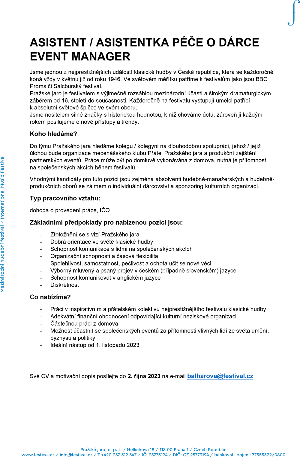 Inzerce Pražské jaro hledá asistenta péče o dárce, eventového manažera Publikováno 21/09/2023 sdílejte: 0 minut čtení sdílejte: TémataSeznam inzerátů Sdílet článek Facebook email zkopíruj odkaz vytisknout sdílejte: Předchozí článek Beyond Vibrations, nový triptych Baletu ND Další článek Adam Plachetka a Ondřej Havelka pokřtili nové album 0 0 hlasy Ohodnoťte článek Odebírat Přihlášení Upozornit na nové a další komentáře nové odpovědi na můj komentář Label {} [+] Jméno* E-mail* Webová stránka Label {} [+] Jméno* E-mail* Webová stránka 0 Komentáře Nejstarší Nejnovější Most Voted Inline Feedbacks Zobrazit všechny komentáře Načíst další