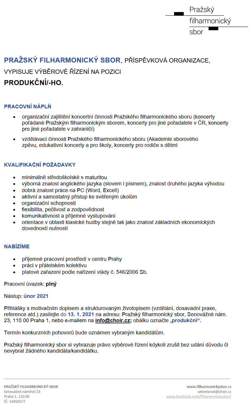 Inzerce Pražský filharmonický sbor hledá produkční/ho Publikováno 08/01/2021 sdílejte: 0 minut čtení sdílejte: TémataSeznam inzerátů Sdílet článek Facebook email zkopíruj odkaz vytisknout sdílejte: Předchozí článek Sledujte online: Zahajovací koncert 9. ročníku festivalu Nová hudba na druhou Další článek Operní panorama Heleny Havlíkové (302) – Bilance koronavirového roku 2020 0 0 hlasy Ohodnoťte článek Odebírat Přihlášení Upozornit na nové a další komentáře nové odpovědi na můj komentář Label {} [+] Jméno* E-mail* Webová stránka Label {} [+] Jméno* E-mail* Webová stránka 0 Komentáře Nejstarší Nejnovější Most Voted Inline Feedbacks Zobrazit všechny komentáře Načíst další