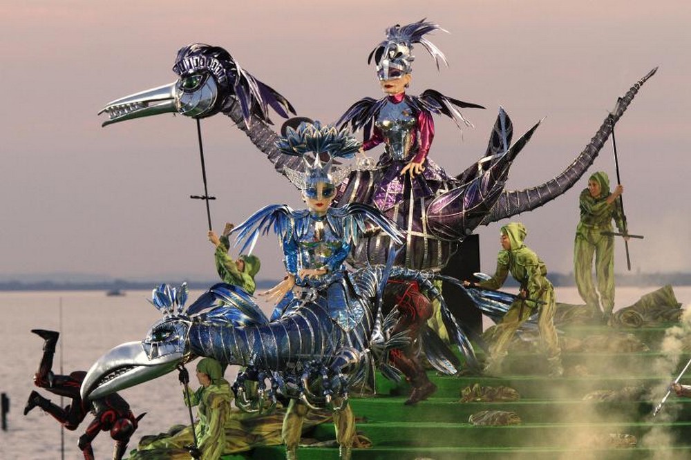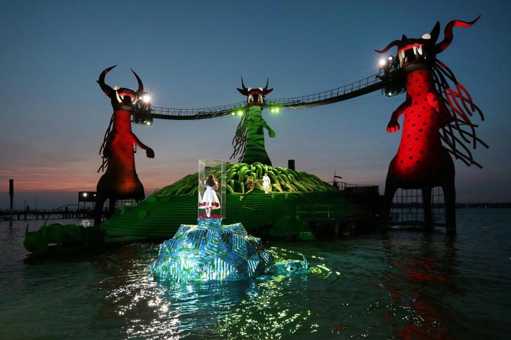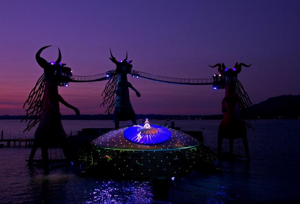 ===Specifikem – a také hlavní atrakcí – Bregenzského festivalu je venkovní scéna na Bodamském jezeře, která je pro každou inscenaci zcela odlišná a je pokaždé znovu speciálně zkonstruována. Vždy je však monumentální a výpravná, a Bregenz se tak může pyšnit tím, že má největší vodní scénu na světě. Jeviště pro letošní inscenaci Kouzelné flétny (jako všechny zdejší hlavní inscenace se bude opakovat podruhé v příštím roce) je postaveno na sto devatenácti pilotech a má úctyhodné rozměry – dlouhé je čtyřicet tři metrů a široké čtyřicet jedna metrů. Složitá konstrukce ze dřeva a oceli má tvar želvy, která je podle scénografa Johana Engelse v řadě mimoevropských mytologií kosmickým symbolem Země či silou na svém krunýři Zemi nesoucí. Výška tohoto konkrétního bregenzského krunýře, který je ve skutečnosti velikým oválným schodištěm, činí téměř deset metrů a jeho vrchní část spočívá na točně, jež má schopnost plynulého otočení o 360 stupňů. Přímo do scény jsou zabudovány desítky reproduktorů, které jsou součástí sofistikovaného systému nazvučení. Ten v reálném čase kombinuje přenos ze sálu Festivalového divadla, kde jsou umístěni dirigent, orchestr a sbor, se zpěvem sólistů na scéně vybavených mikroporty, u nichž se také snaží o zachování prostorové reality zvuku. Pro úspěch každého představení jsou proto důležité nejen umělecké výkony hudebníků, ale i pečlivá práce velkého počtu technického personálu, a významnou roli zde mají také kaskadéři, potápěči, pyrotechnici a statisté.+++